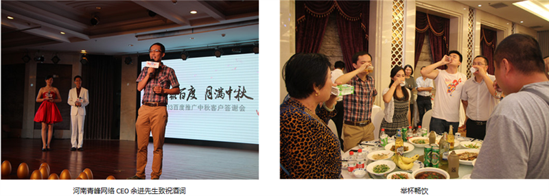一杯杯酒,一首首歌,道不尽的问候,送不完的祝福,在这收获的季节,让我们共同举杯,祝福彼此。通过本次答谢会,进一步沟通了客服人员与客户的感情,也更加巩固了百度推广在客户心中的品牌形象,坚定了他们与百度携手,从一个成功走向另一个成功的信心!