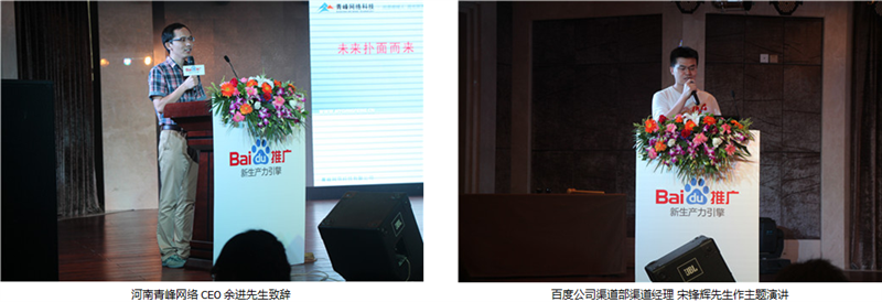 莅临本次答谢会现场的领导有:百度公司渠道部渠道经理宋锋辉先生,百度公司业务运营部区域经理何蓓女士,河南青峰网络科技有限公司CEO 余进先生。会议前半场,青峰网络CEO余进先生致开场词,并带来了《未来扑面而来》的精彩演讲,带领与会嘉宾一起回顾了互联网发展的潮流,并以自己多年互联网从业经验,预测未来互联网发展的趋势,引得台下阵阵掌声。接下来,由百度公司渠道部渠道经理宋锋辉先生带来主题演讲,宋经理向到场的嘉宾介绍了百度2013年在各领域取得的巨大成就,并着重介绍了百度推广新推出的品牌起跑线、问答营销、企业之窗等新产品,扩大了客户网络营销的视野,坚定了与会嘉宾与百度推广一起成长的信心。